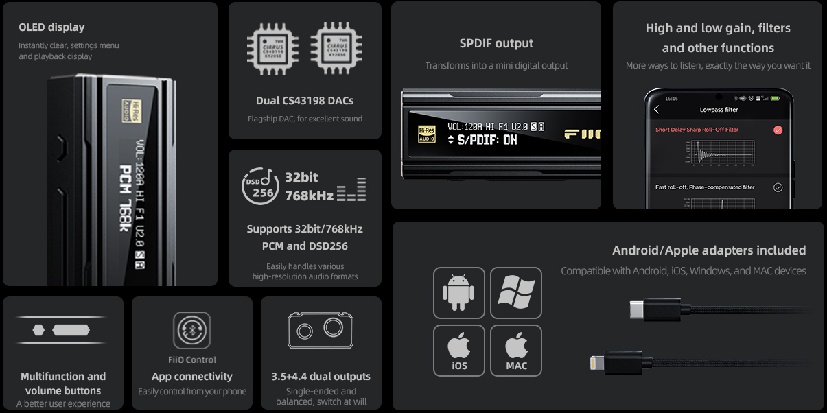 OLED display | CS43198 x2 DAC | SPDIF utgang | App-støtte | 3,5 og 4,4 utgang | 32 bit 768 kHz | App støtte